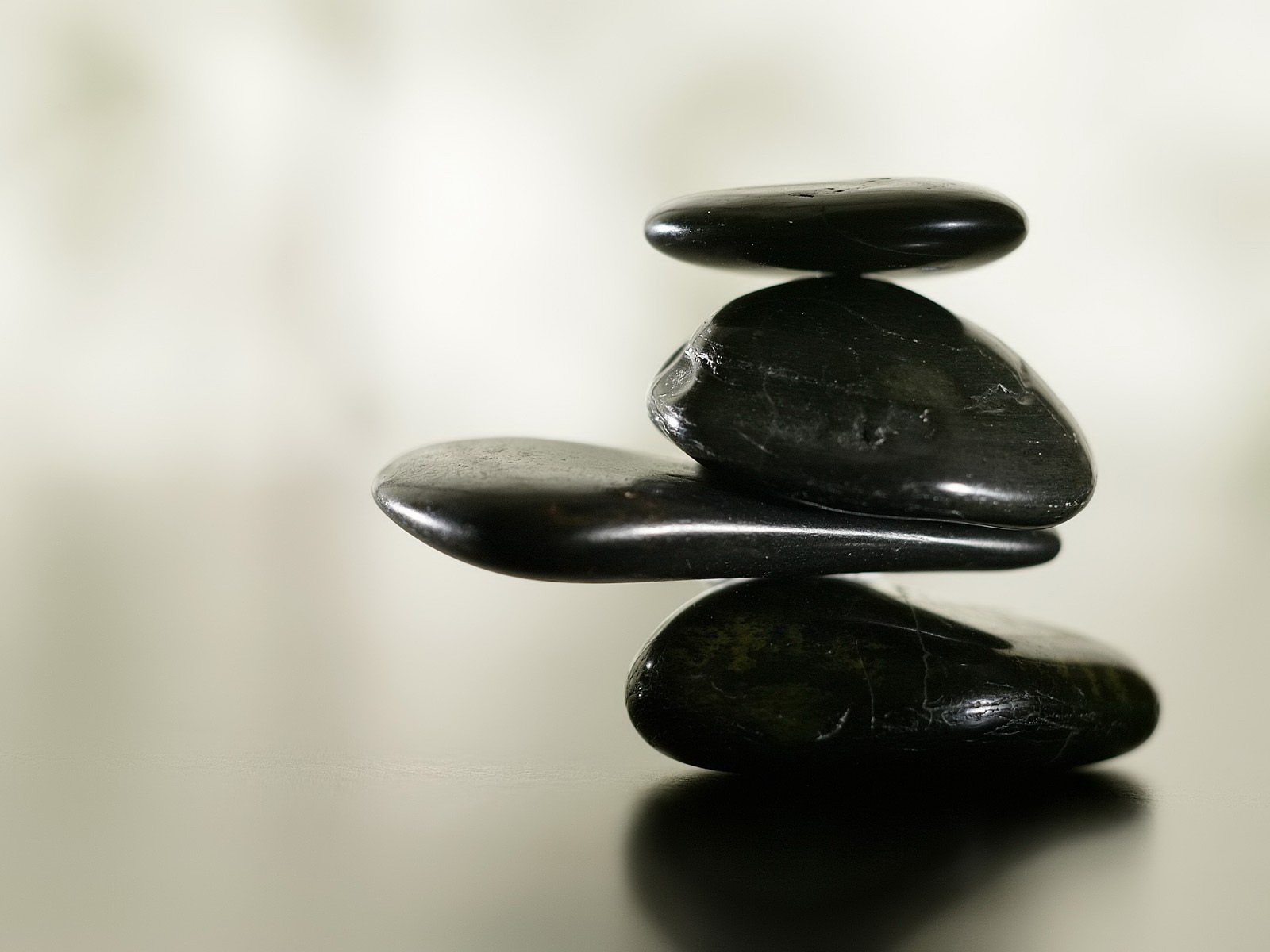 Perfume bottle next to orchid and black massage stonesPerfume bottle next to orchid and black massage stones