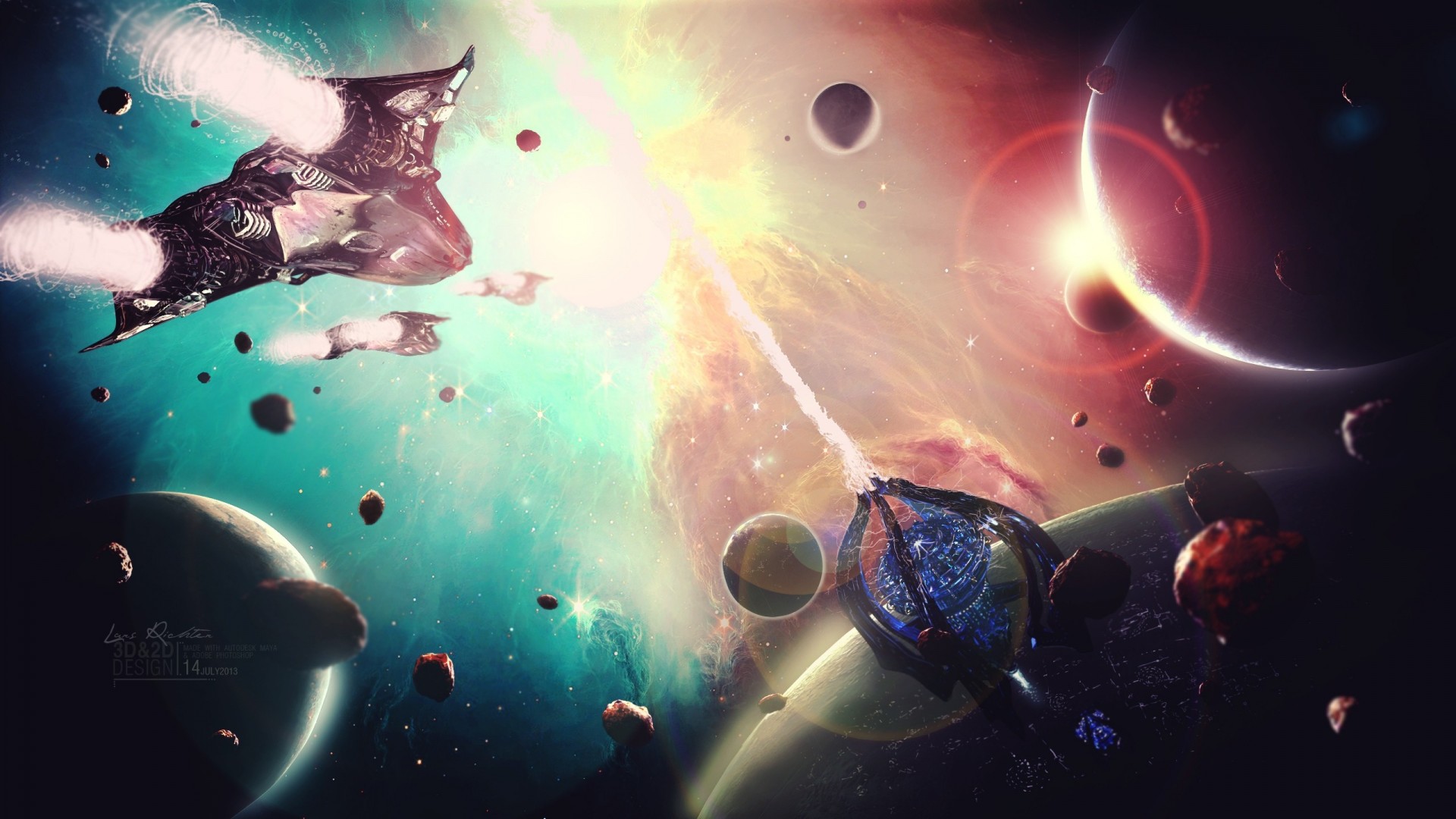 Bright blue spaceship against the background of stars and spaceBright blue spaceship against the background of stars and space