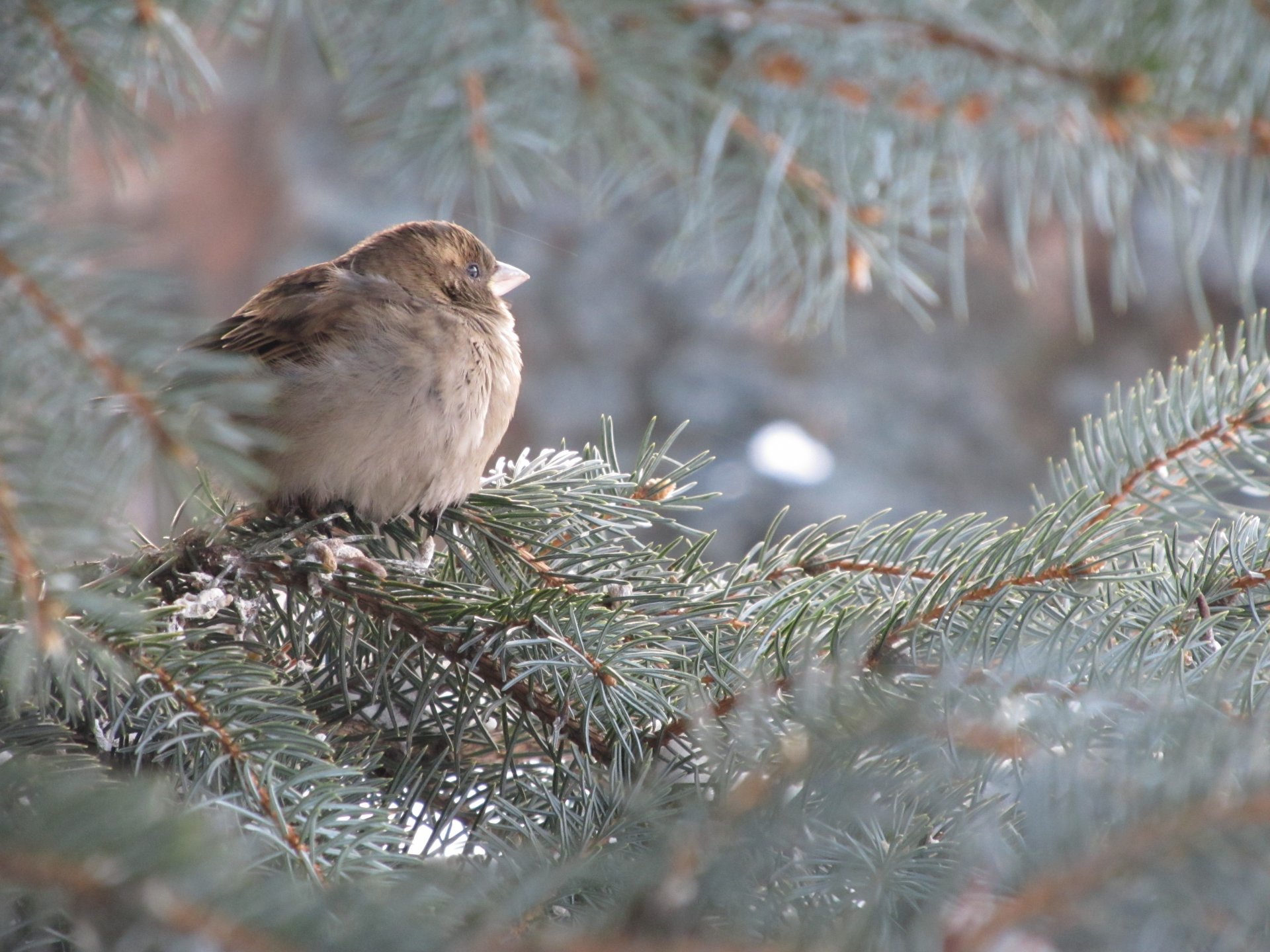 A perched sparrow on a blue spruce