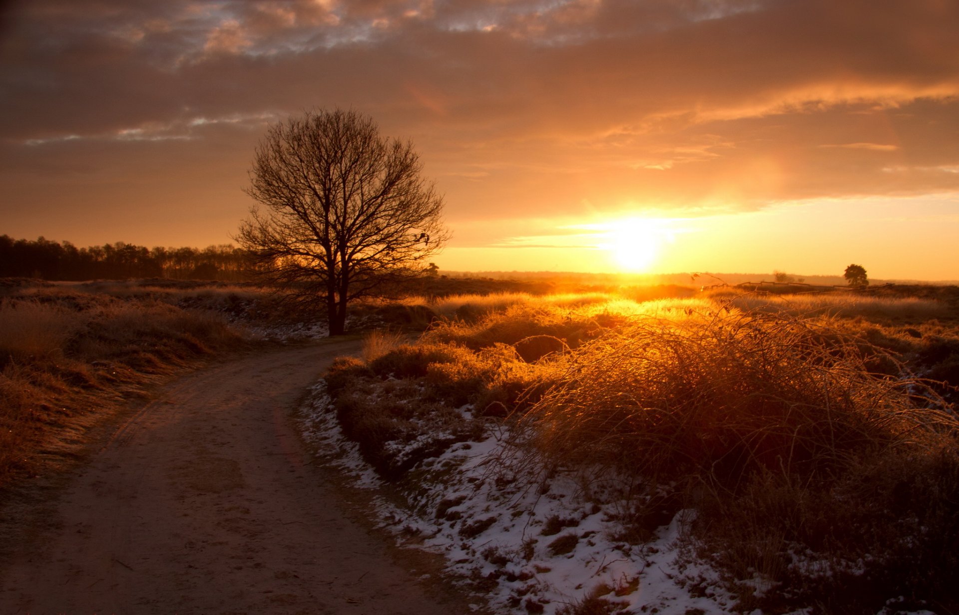 A sunset in the background with a stunning landscapeA sunset in the background with a stunning landscape