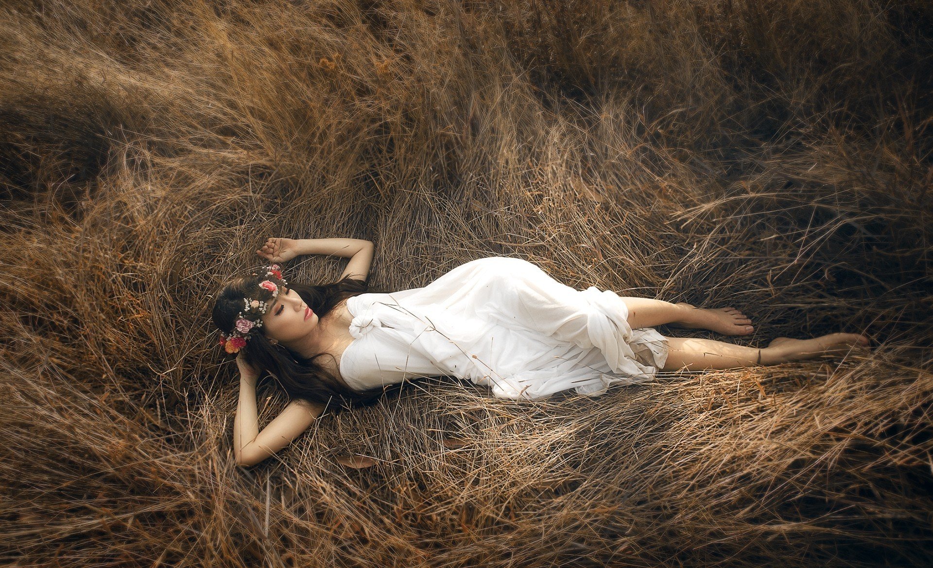 A girl in a beautiful dress and shoes is lying on the bedA girl in a beautiful dress and shoes is lying on the bed