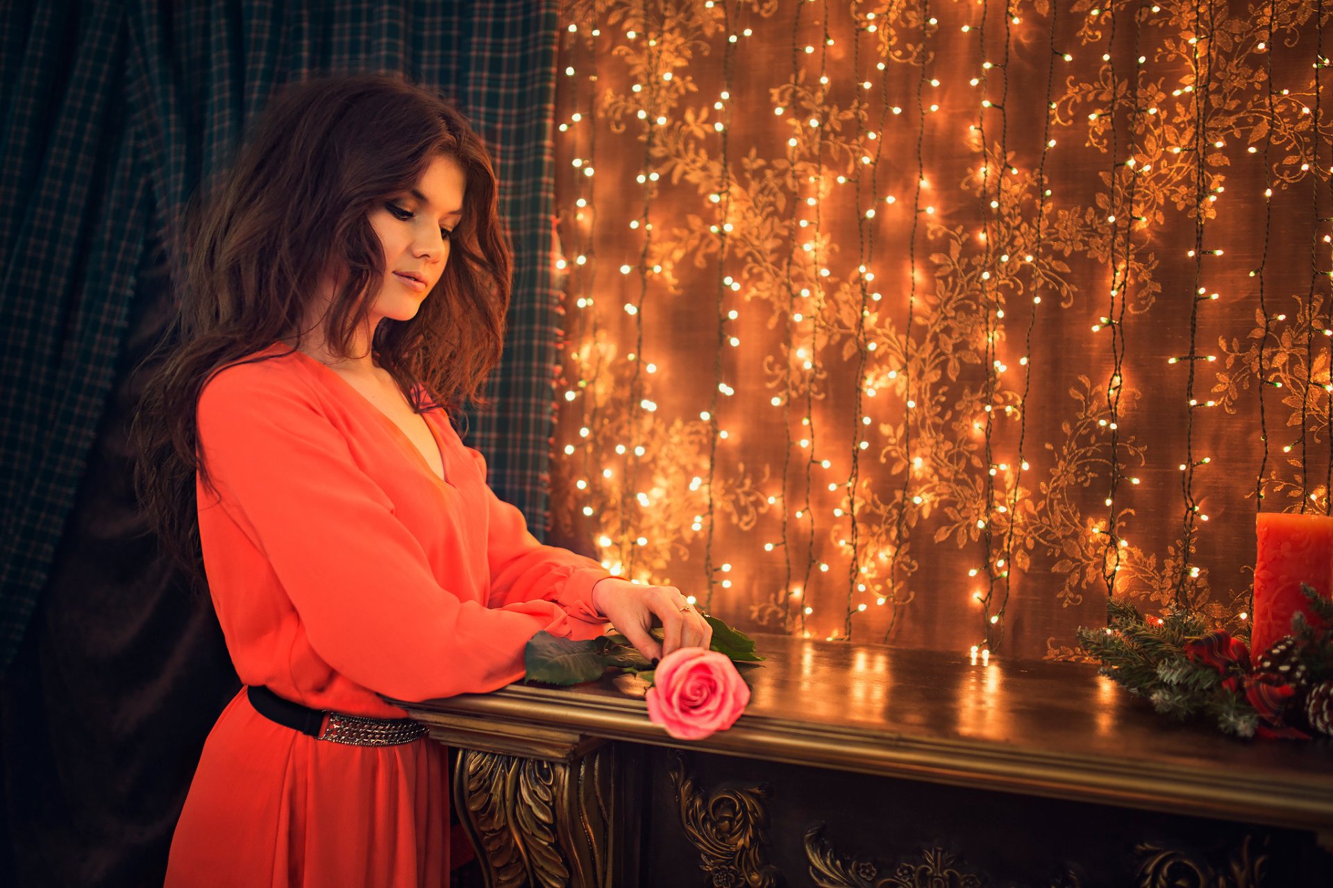 The girl in the red dress at the garlands