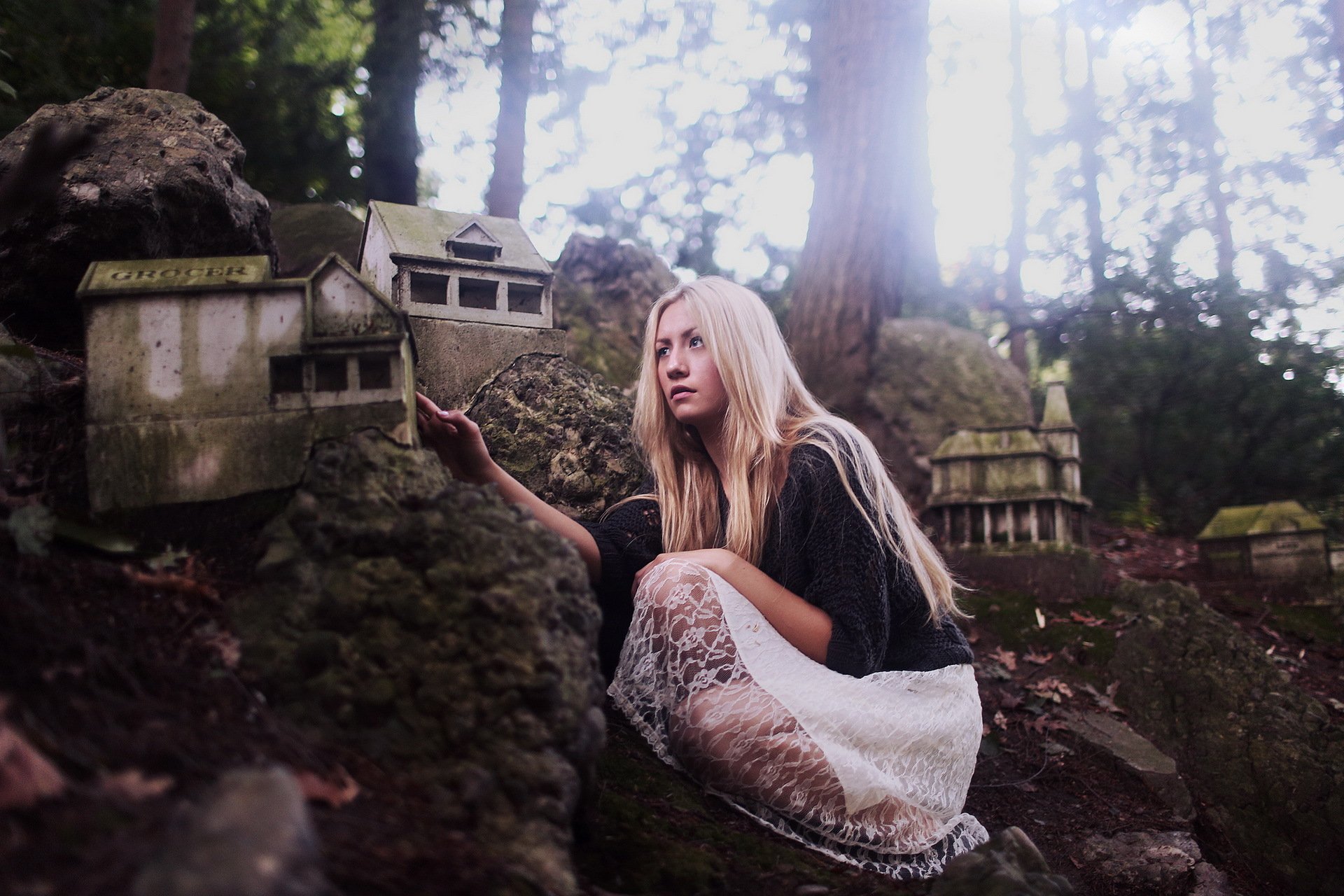A toy in the form of a girl is standing in the snow, and behind the white lightsA toy in the form of a girl is standing in the snow, and behind the white lights