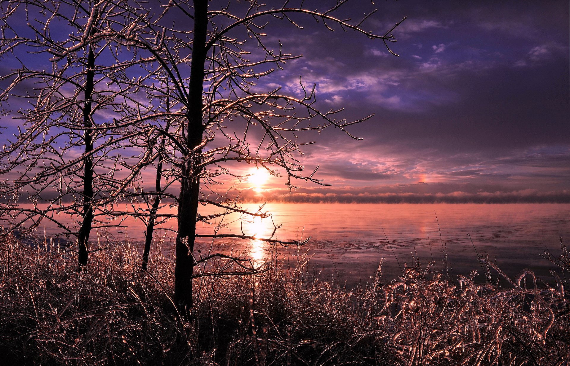 A bridge in the autumn forest on the lake in the fog in the sunlight