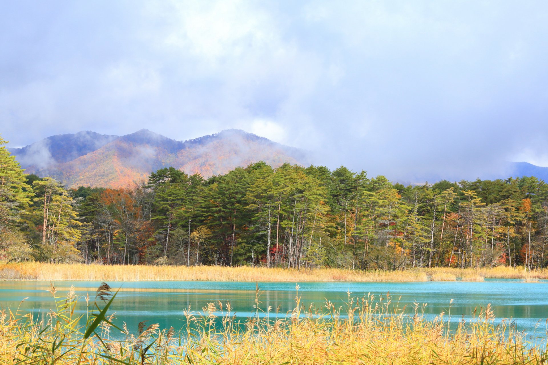 Misty lake in the mountains in autumn