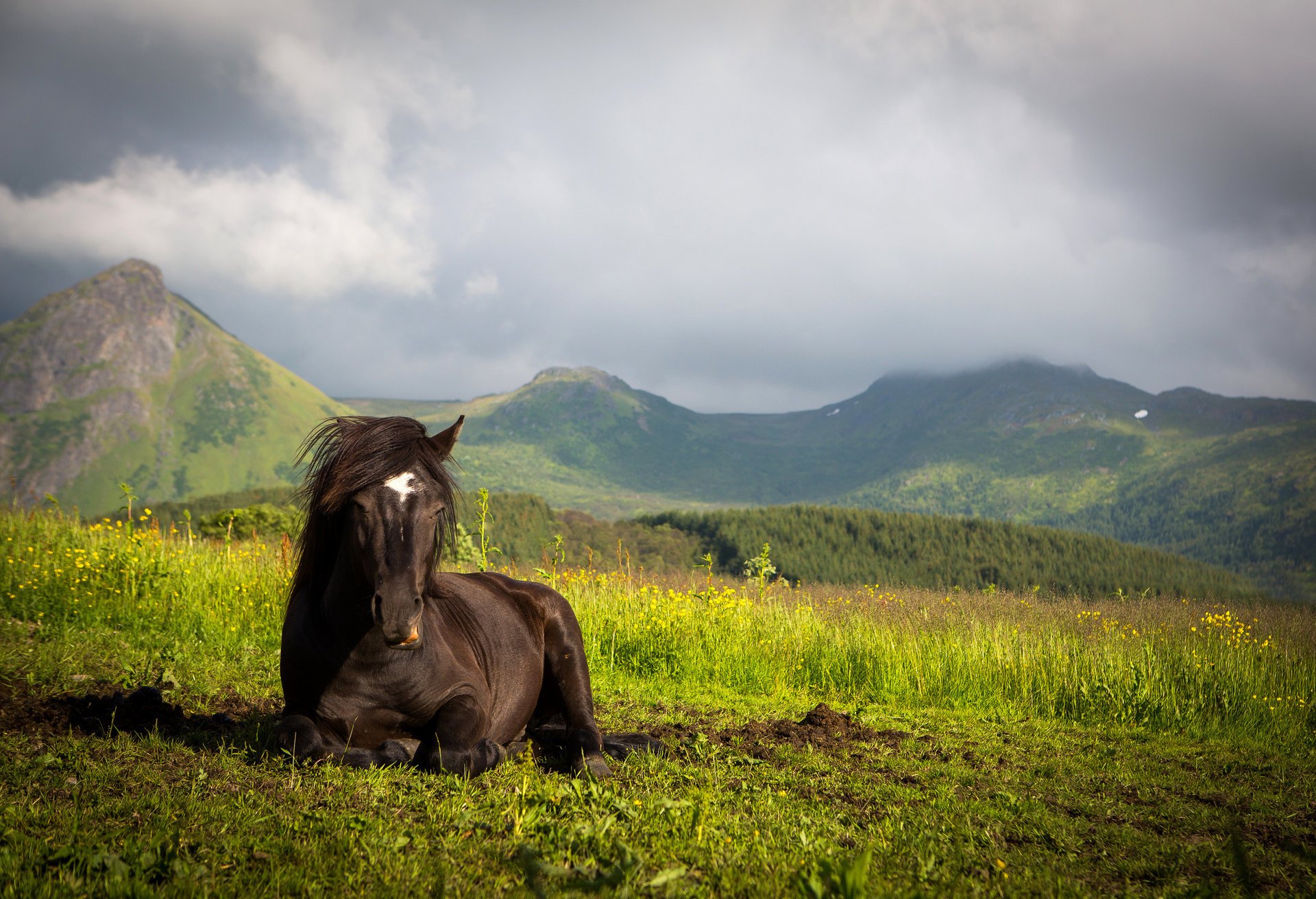 Against the background of the sunset sky, a horse in the mountainsAgainst the background of the sunset sky, a horse in the mountains