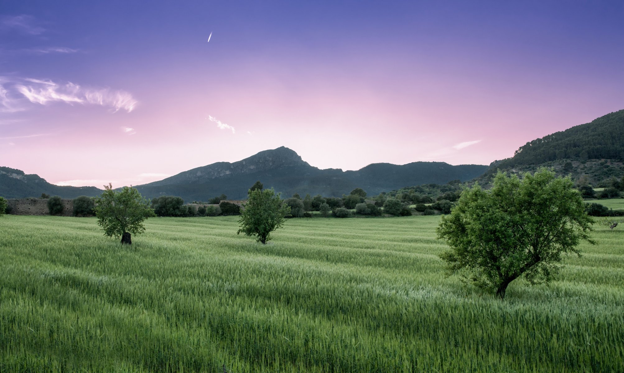 A green field against a mountain background and a purple skyA green field against a mountain background and a purple sky