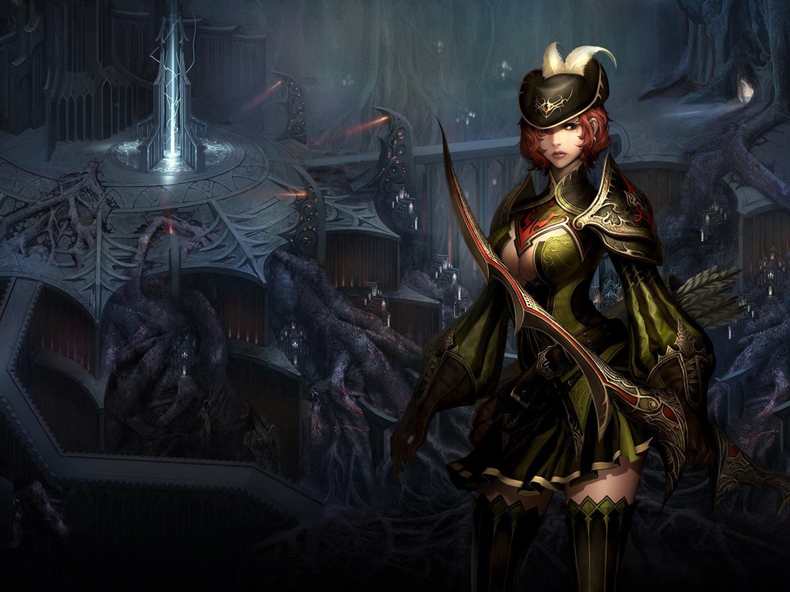 An archer in a hat and armor on the background of a fantastic landscapeAn archer in a hat and armor on the background of a fantastic landscape