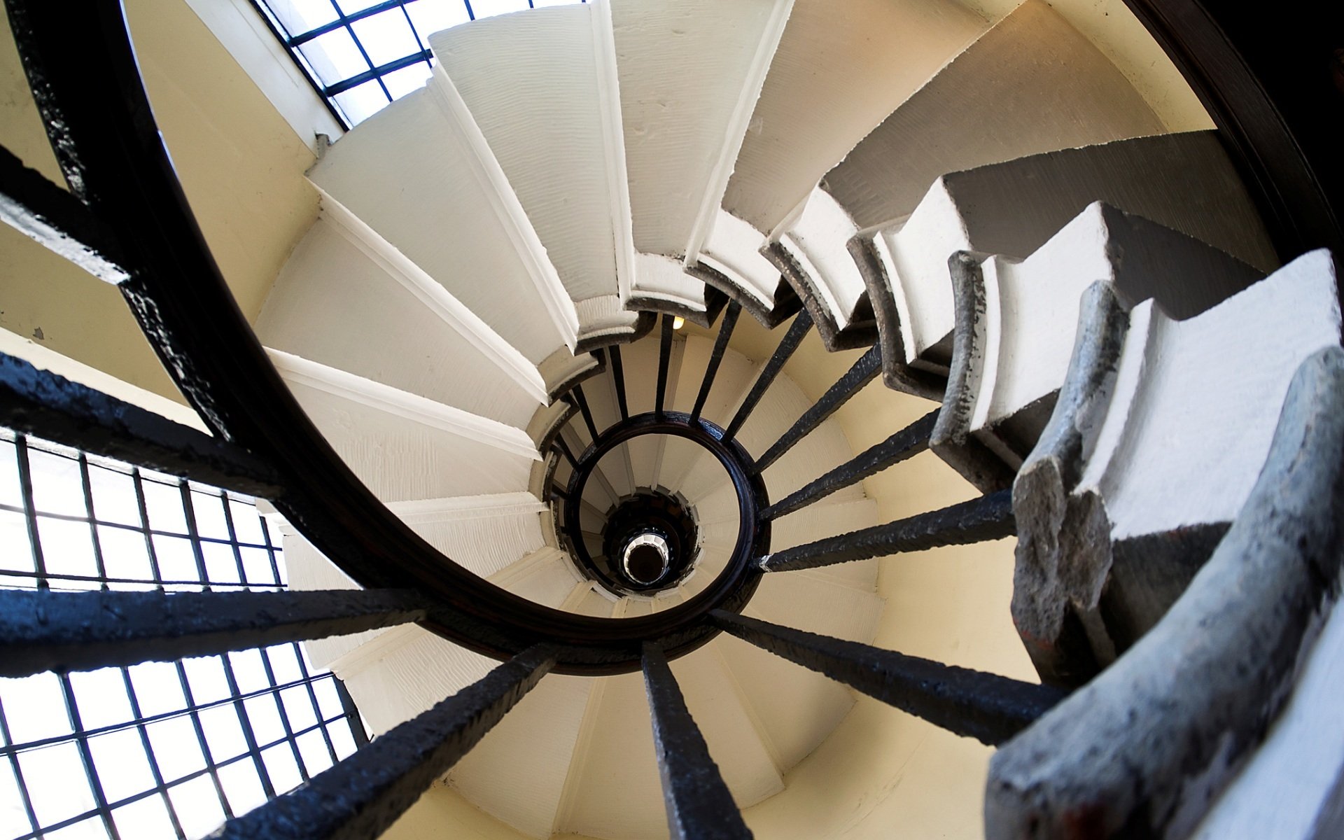 Top view of a long spiral staircase with openwork railingsTop view of a long spiral staircase with openwork railings
