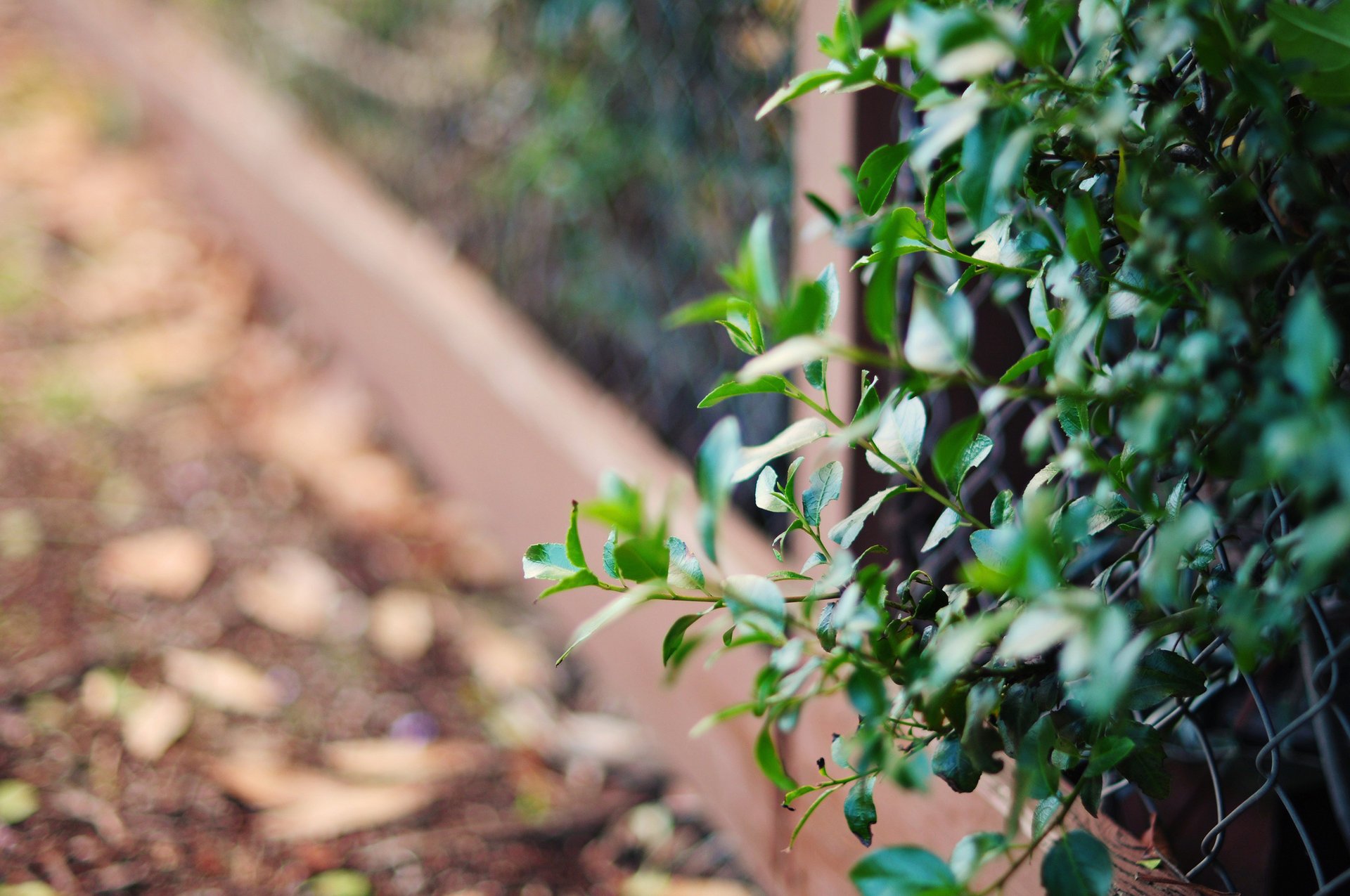 Green leaves peek out of the grid