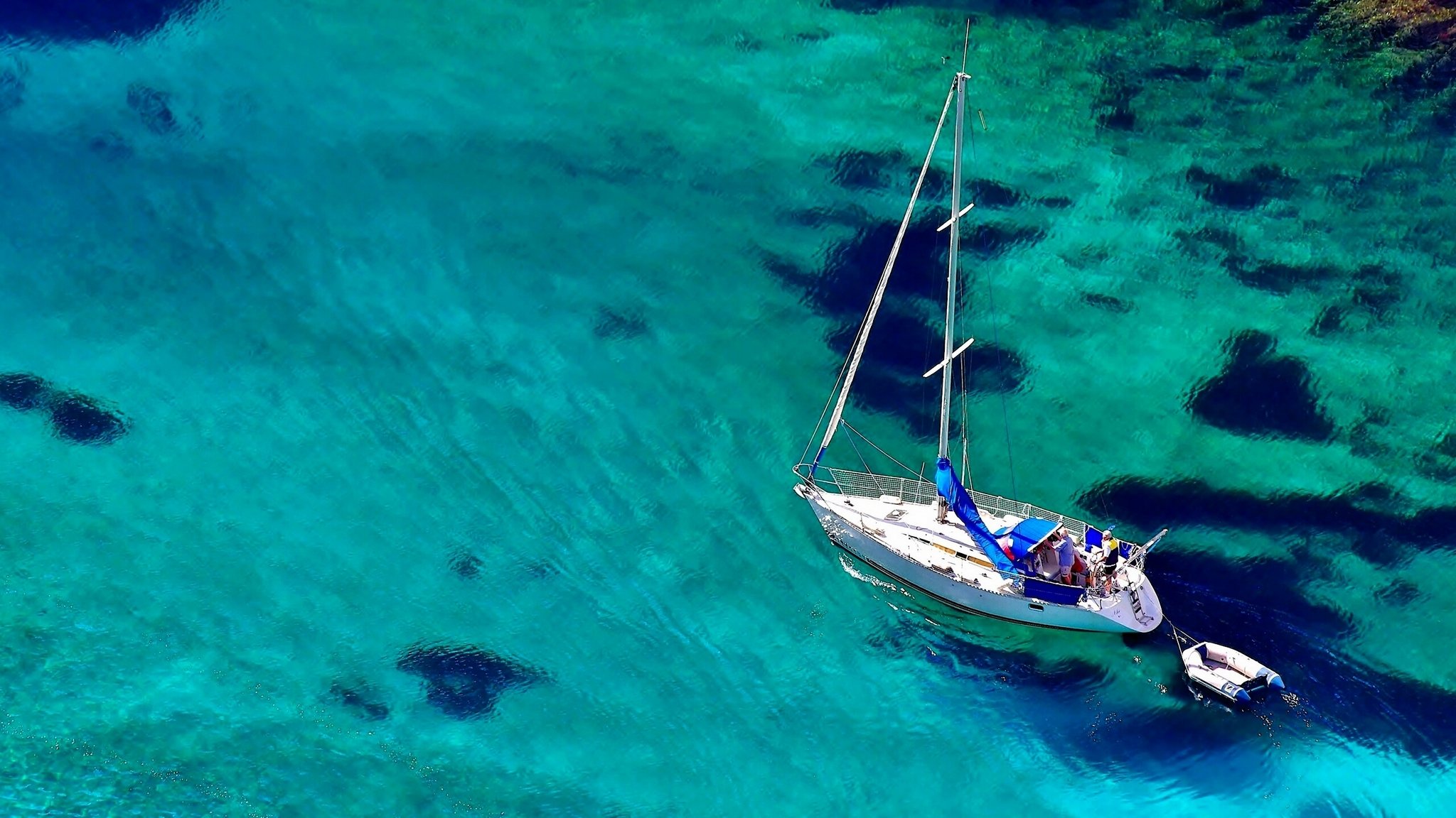 A ship with sails in the sea against the background of cloudsA ship with sails in the sea against the background of clouds