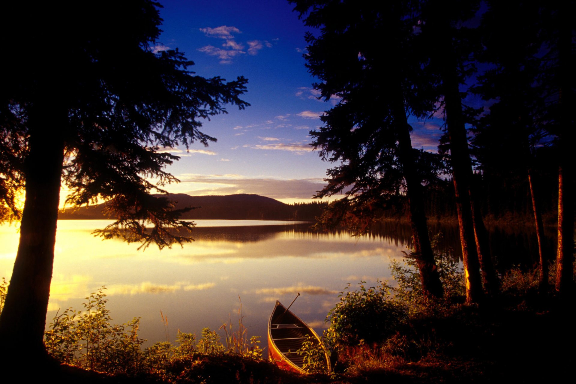 Boat on the lake in the trees and a beautiful sunsetBoat on the lake in the trees and a beautiful sunset