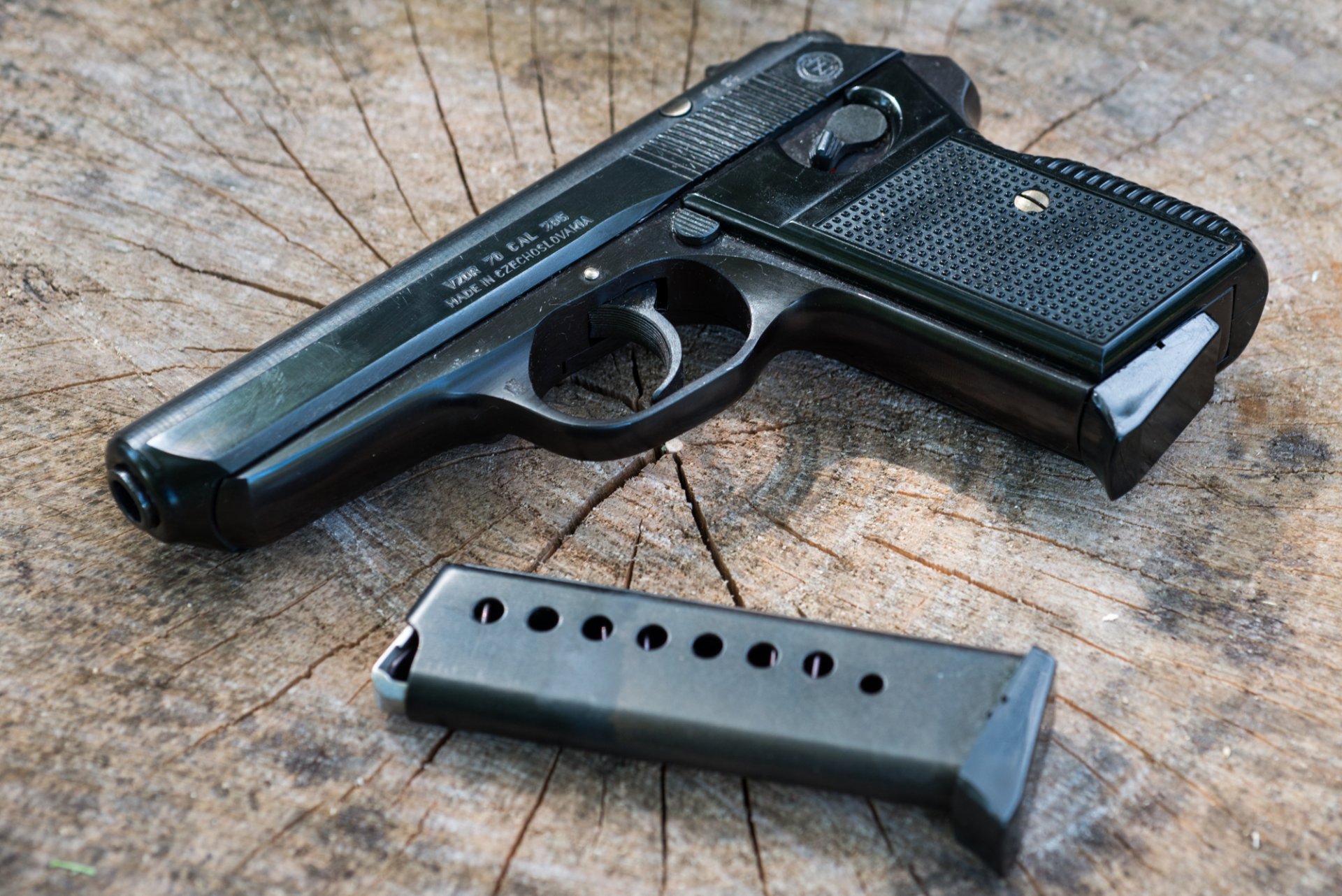 Walther pp self-loading pistol lying on a blue clothWalther PP self-loading pistol lying on a blue cloth