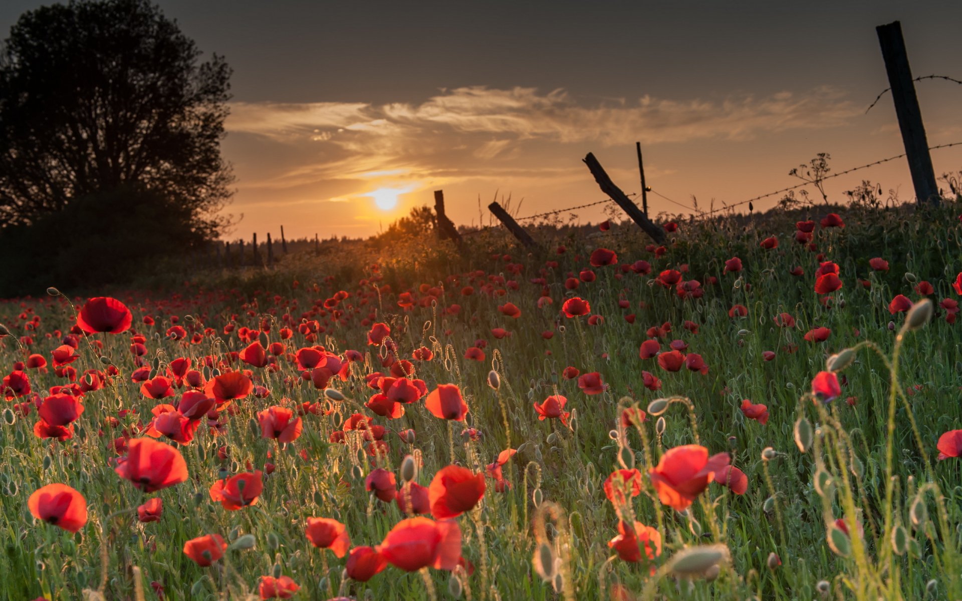 Red poppies at sunset