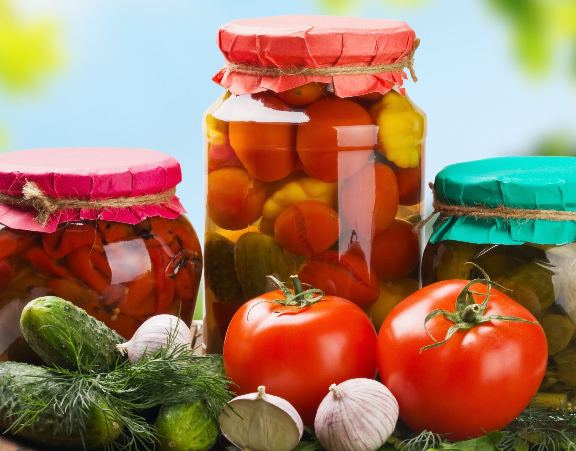 Fresh vegetables and jars of pickles