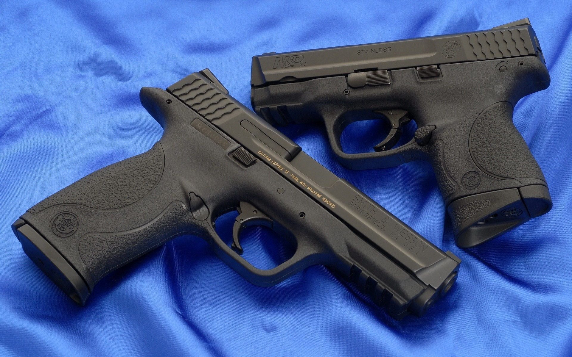 Two black police pistols on a background of blue fabricTwo black police pistols on a background of blue fabric