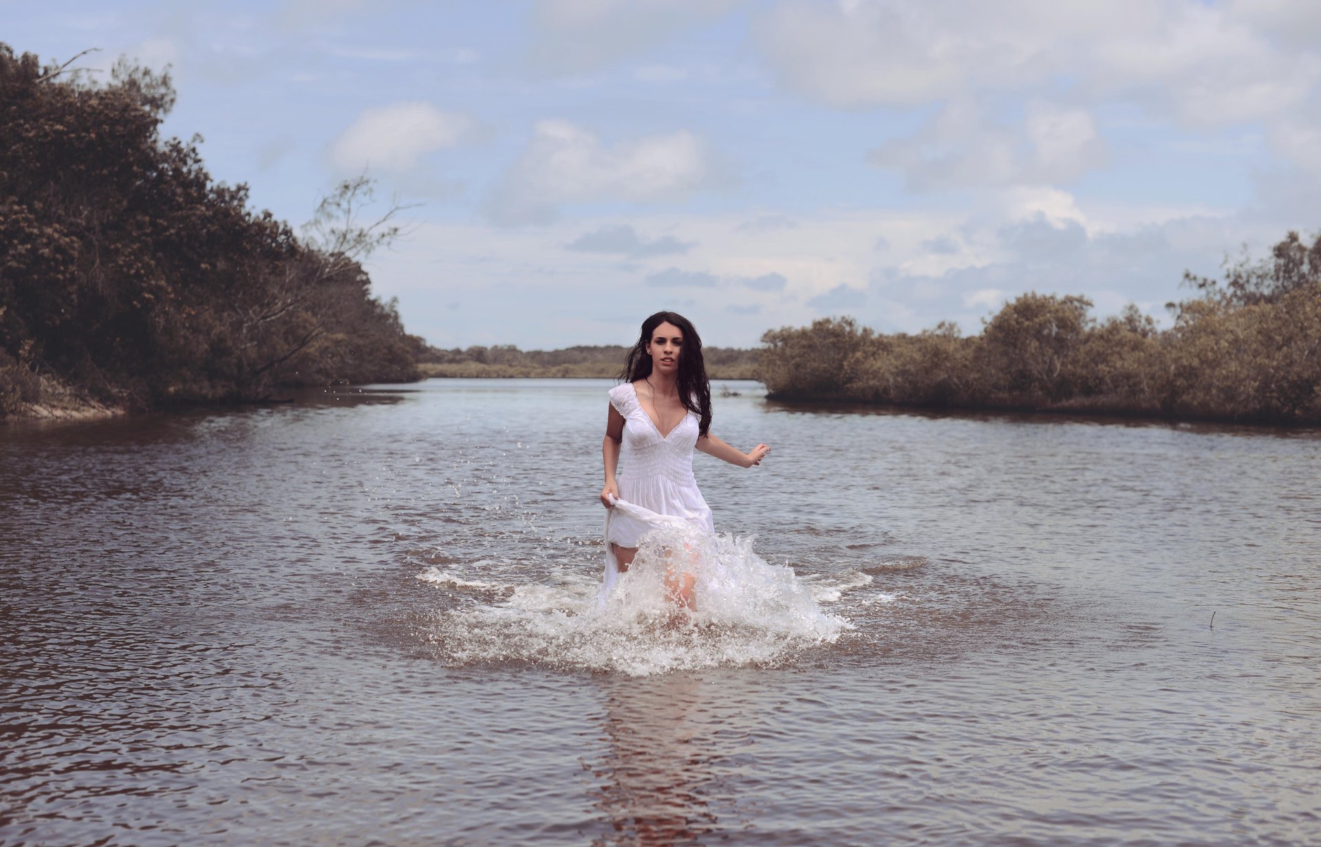 A girl in a white dress creates splashes in the riverA girl in a white dress creates splashes in the river