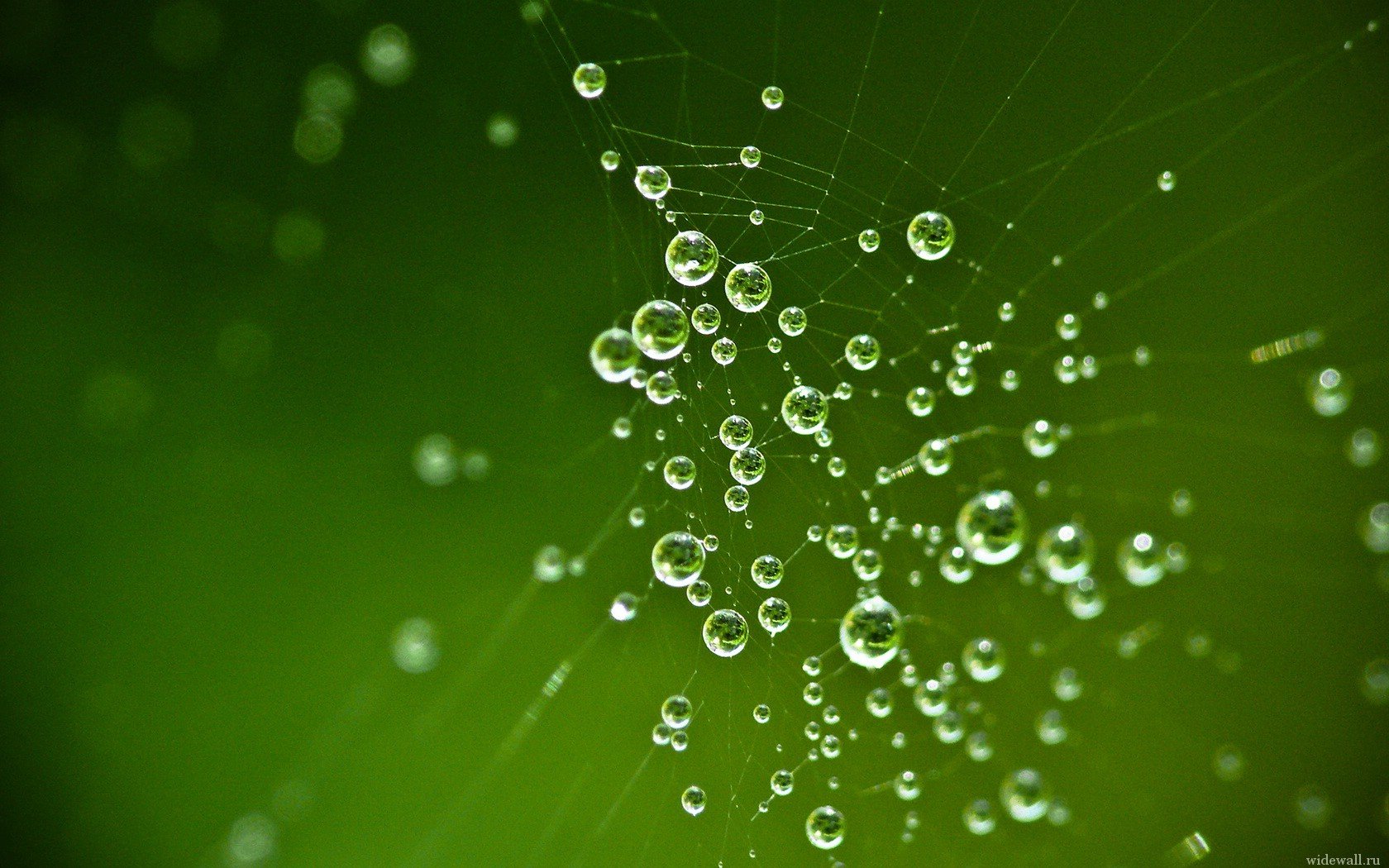 Water drops in a web on a green background