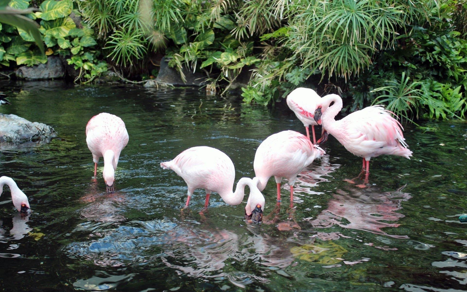 Pink flamingo drinks water from the river