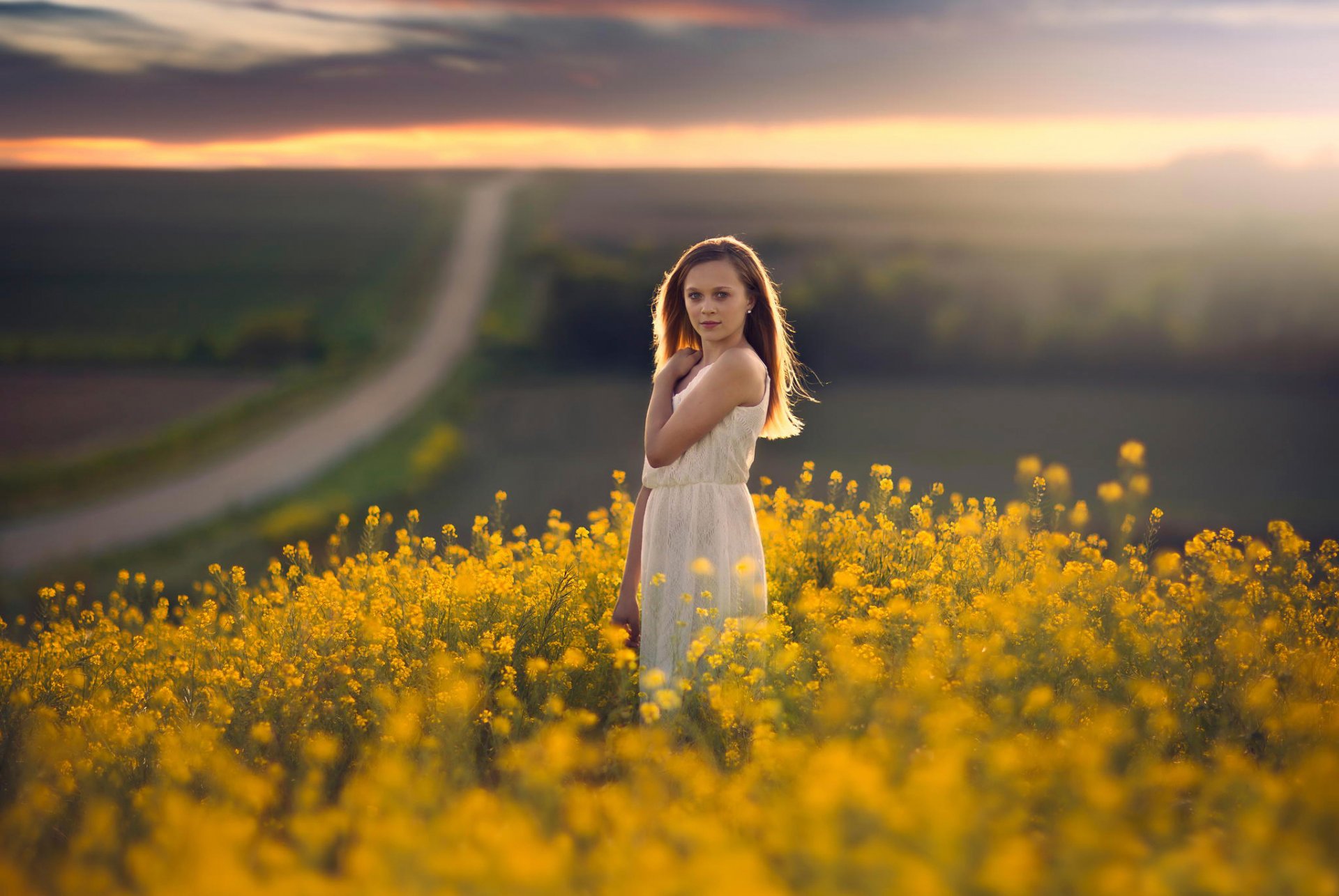 A girl in a field in flowers and a road going into the distanceA girl in a field in flowers and a road going into the distance