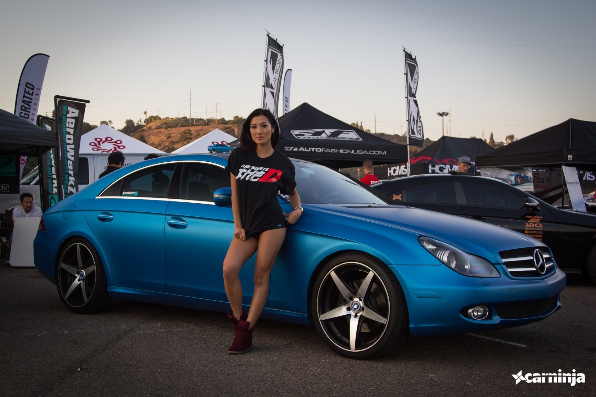 A cute brown-haired woman in a blue swimsuit is sitting in the bathroom