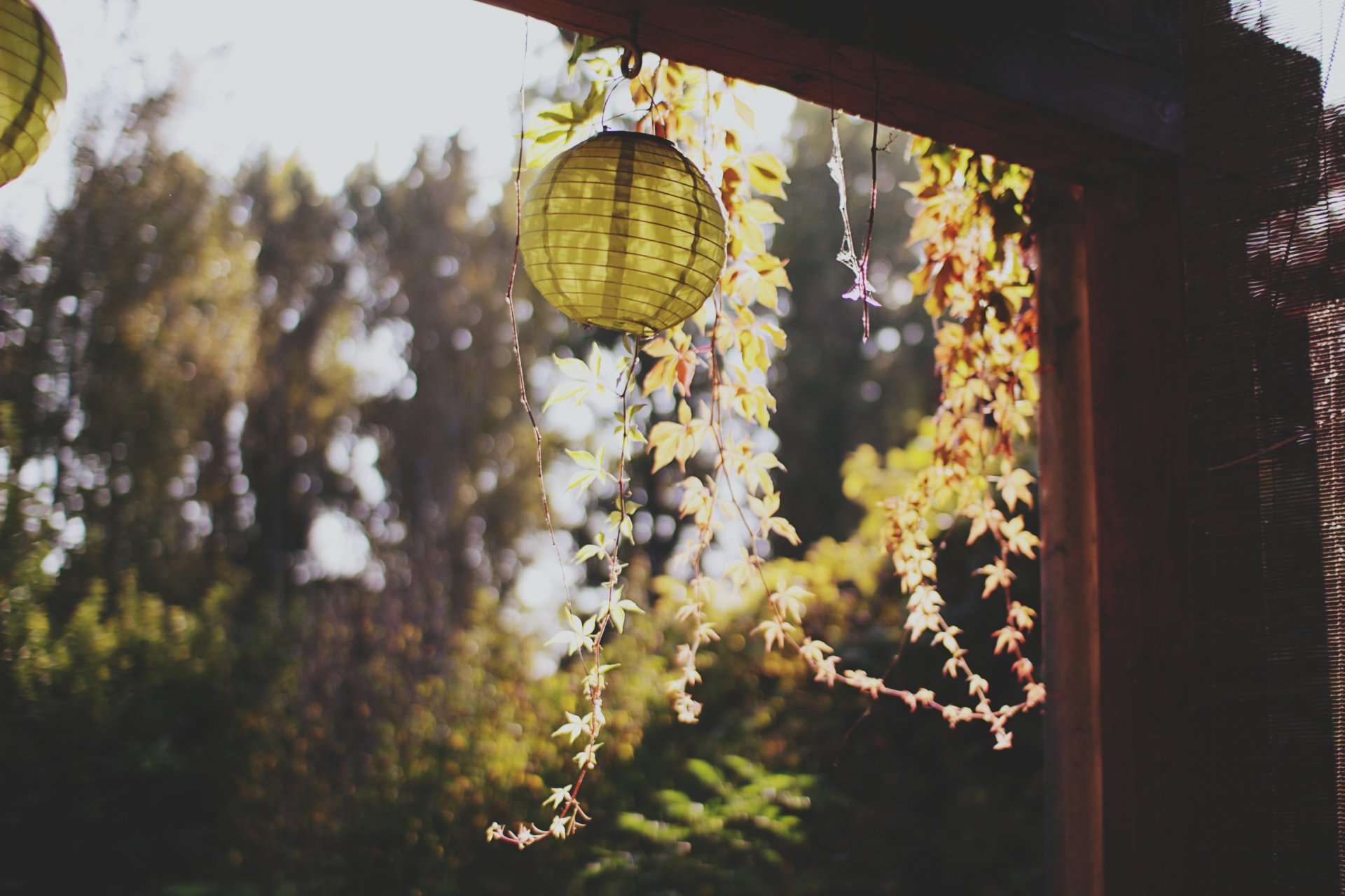 Yellow wall with a wooden window curtained with blue fabricYellow wall with a wooden window curtained with blue fabric