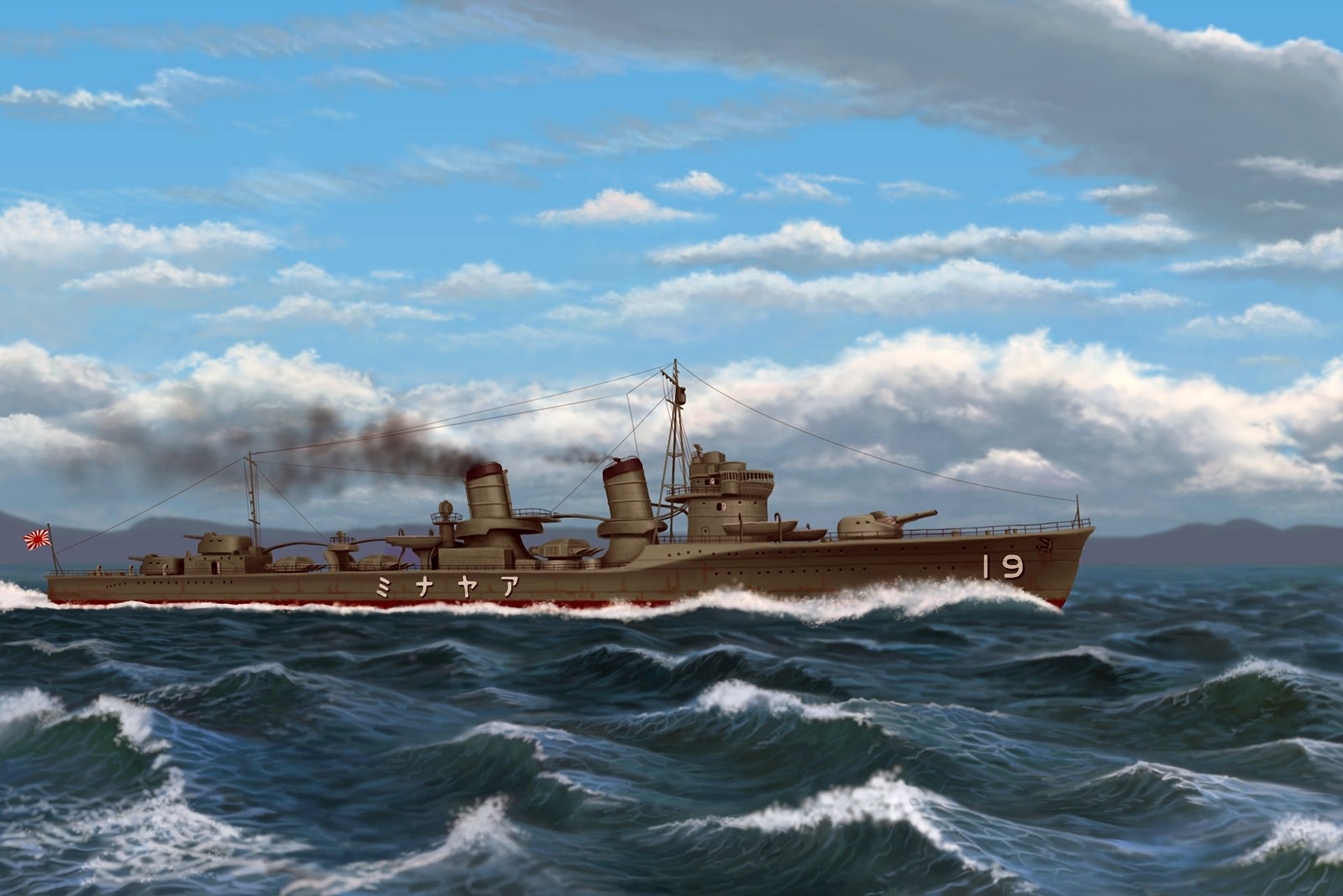A ship in a blue sea against a background of cloudsA ship in a blue sea against a background of clouds
