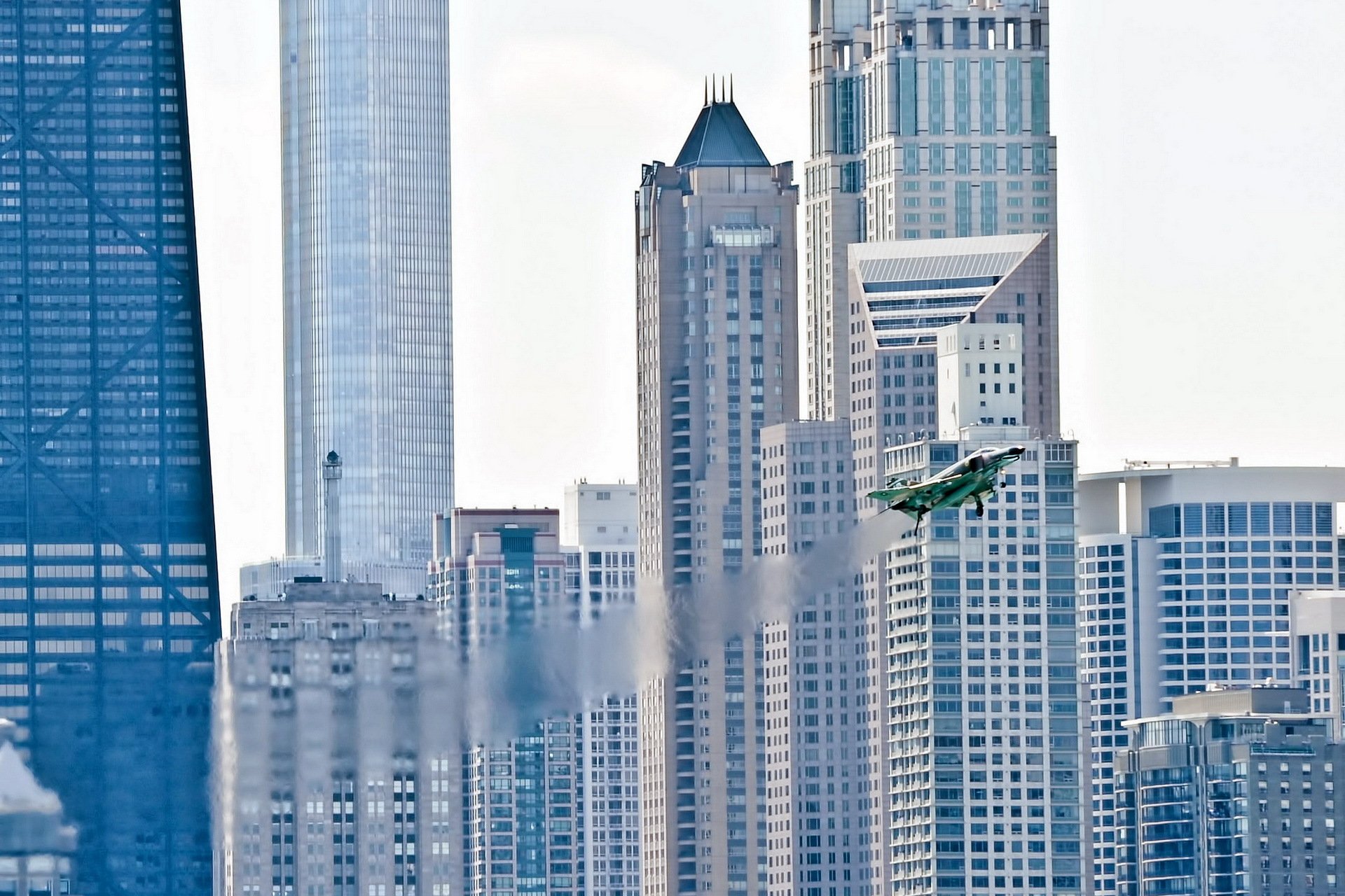 Inside the city, a fighter performs the wonders of aerobaticsInside the city, a fighter performs the wonders of aerobatics