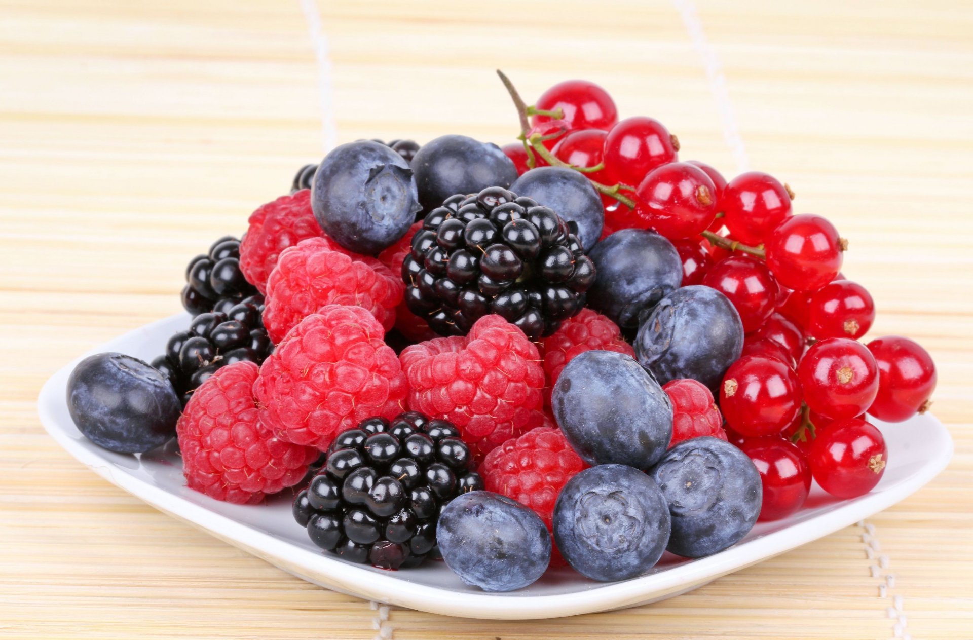 A plate of various berries raspberries blueberries currantsA plate of various berries raspberries blueberries currants